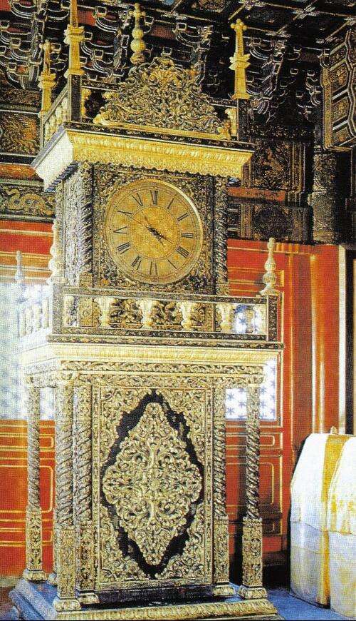 中西计时方法的并存,还可以从清宫计时器的陈设窥见一斑。在清宫众多殿宇前都设置有日晷。日晷的晷面刻度多为九十六刻,遵循的是康熙朝历法改革之后推行的九十六刻计日,而非中国传统的百刻计日。日晷虽然可以测量日影以计时,但在清代已不具备真正意义上的计时功能,而是更多带有象征意义。