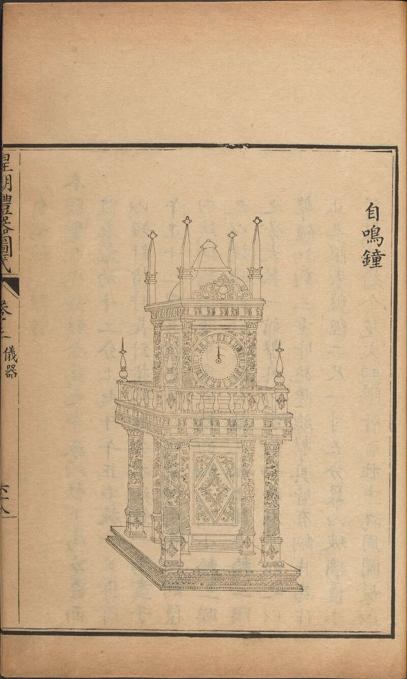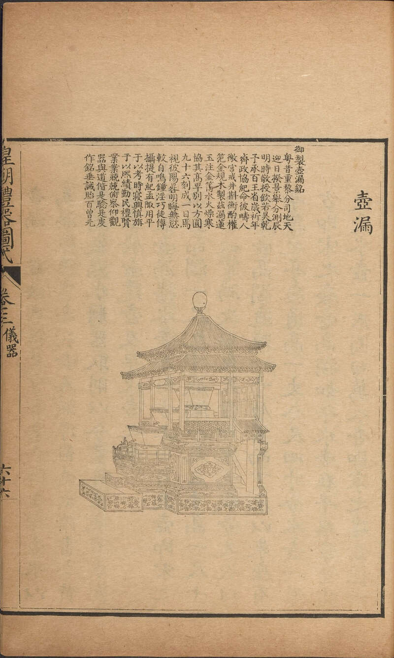 交泰殿作为清内廷后三宫之一,位于乾清宫和坤宁宫之间。在交泰殿中同时陈设着中西两种计时工具(图13)。东次间设置中国传统的铜壶滴漏。西次间设置西洋大自鸣钟。铜壶滴漏(图14)体型巨大,制造于乾隆十年(1745)。作为礼器编入《皇朝礼器图式》“仪器”类之中。(图15)乾隆帝曾为其撰写《御制漏壶铭》,称“九十六刻成一日”。后因年久失修且计时不便,铜壶滴漏被废置不用。大自鸣钟(图16)作为西洋机械计时装置,同样编入《皇朝礼器图式》“仪器”类之中(图17)。大自鸣钟不仅作为礼仪象征陈设在交泰殿中,而且因为计时准确一直在使用。其钟声洪亮悠远,可直达乾清门外。入宫当值的大臣们需要依靠交泰殿大自鸣钟报时,来校准自身所携带怀表时间是否准确。