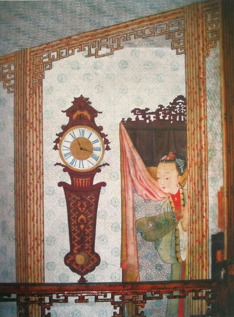 在倦勤斋西殿二层楼梯转角处,有一处足以乱真的通景线法画,图绘的是一位半撩门帘的婉约女子。(图10)在美人身旁还绘出几案、书册等屋内陈设。门帘旁还绘有一件西洋自鸣挂钟。这座西洋自鸣挂钟为木质外壳,上部为木雕楼式顶盖,中部为圆形铜质表盘,下部可见镀金长圆摆。整座挂钟的装潢样式具有西洋风格,在清宫钟表收藏中未见实物,可能是画家根据西洋资料设计绘制而成。挂钟表盘上的指针被院画家描绘出来,精准地指向11时18分。