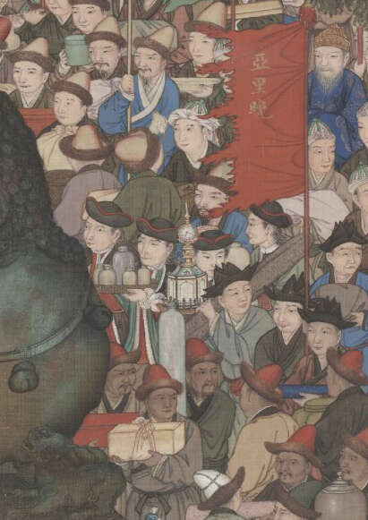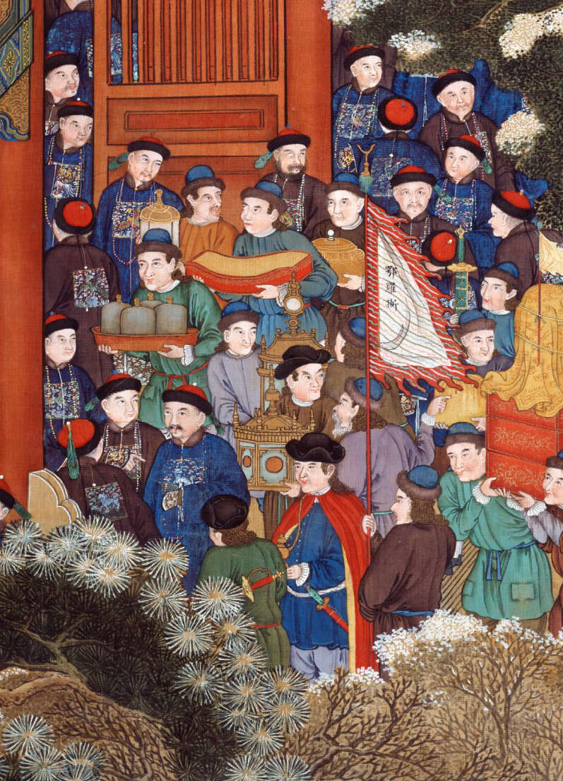 西洋钟表不少是传教士携带进献入宫,钟表朝贡也出现在清宫绘画之中。乾隆朝画院曾在乾隆帝授意下绘制过多幅《万国来朝图》。这些画作尺幅较大,由多位画院画家合作完成,绘成后悬挂于养心殿及养性殿明窗。《万国来朝图》构图近似,以鸟瞰的视角展现了冬日雪景中的紫禁城。前景重点描绘的是清朝藩属国及外国使臣进宫朝贺的场景,其中既有亚洲的安南、朝鲜等国使臣,也有大洋彼岸的英吉利、法兰西等国使者。他们携带礼物,熙熙攘攘,热闹非凡。不过画面中所表现的多国使节共同来京朝拜的场景,在历史上并未真实发生过。《万国来朝图》是乾隆帝为了宣扬自身政绩所构建出来的理想帝国形象,并不是纪实性绘画,但其中带有历史真实成分。