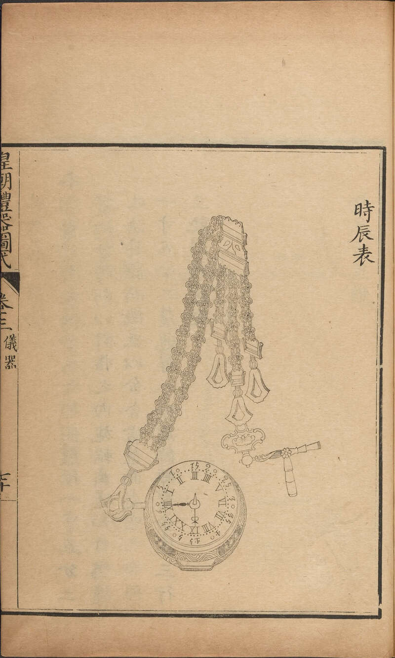 雍正朝宫廷画家所绘制的《十二美人图》,对物品陈设描绘地极为写实。其中一幅《持表对菊图》(图1),表现的是一位古装美人手持珐琅怀表倚桌而坐的情景。怀表,当时被称为“时辰表”。美人手中怀表样式为铜壳珐琅怀表,以罗马数字标识时间,清宫藏有多件类似款式的怀表。(图2)时辰表不仅作为计时工具,还作为礼器,收录于《皇朝礼器图式》“仪器”类之中。(图3)《皇朝礼器图式》称“本朝制时辰表,铸金为之,形圆。盘径一寸五分二厘,均分时刻,以针指之。内施轮齿,皆如自鸣钟之法,具体而微。”详细说明了乾隆朝时辰表的制作工艺。
