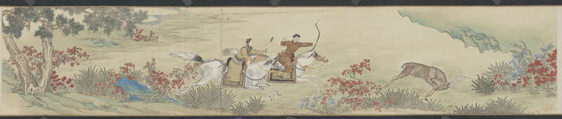 当皇帝出巡在外时,钟表也是十分重要的随行物件。乾隆帝恪守满洲祖训,继承前朝规制,在每年的八九月间进行木兰秋狝。清宫画家也会跟随出行,绘制画作。《弘历威弧获鹿图》图绘的就是乾隆帝在木兰围场中弯弓搭箭、骑马逐鹿的场景。(图7)他身旁还有一位妃子骑马追随,正将一支羽箭递给乾隆帝。在乾隆帝及妃子骑坐的马鞍鞍桥前都镶嵌有钟表。乾隆帝有不少御用嵌表马鞍。马鞍平时存储于北鞍库,由武备院负责。马鞍上的钟表则拆下存于做钟处,以便日常维护修理,使用时再安装在一起。除此画外,还有《弘历射猎图》、《弘历锦云良骏图》等清宫画作描绘出马鞍上的钟表。