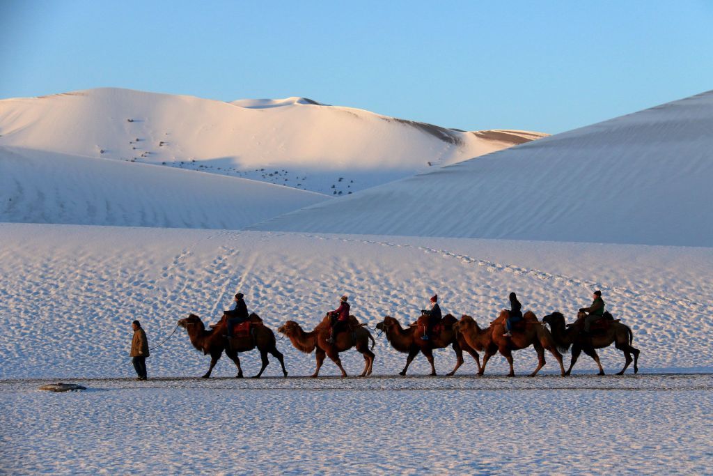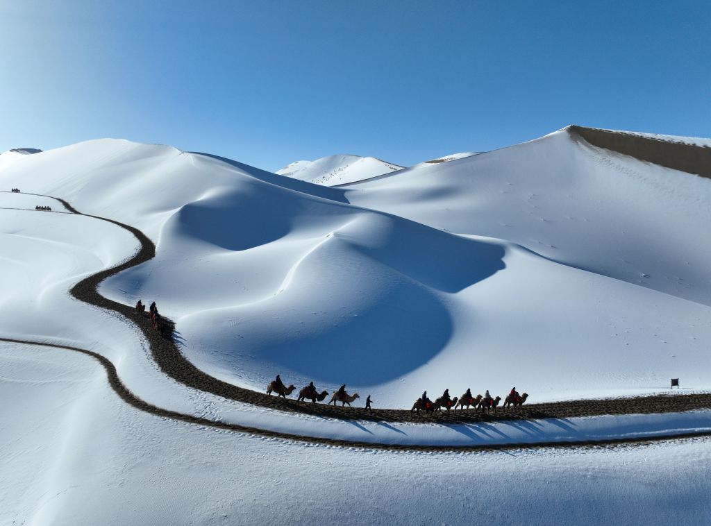 2023年11月15日,甘肃酒泉,敦煌鸣沙山月牙泉景区,游客在骑骆驼欣赏雪景。