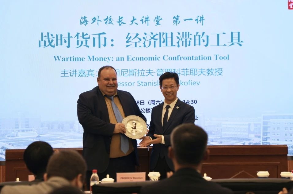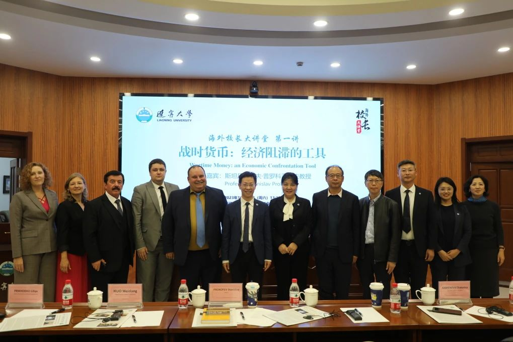 10月28日下午,辽宁大学海外校长大讲堂(第一讲)在蒲河校区校部办公楼317会议室举行。俄罗斯联邦政府财政金融大学校长、俄罗斯联邦荣誉经济学家、俄罗斯联邦二级国家顾问、俄罗斯联邦税务局公共委员会委员斯坦尼斯拉夫·普罗科菲耶夫(PROKOFIEV Stanislav)教授应邀作了题为《战时货币:经济阻滞的工具》(Wartime Money: An Economic Confrontation Tool)的学术报告。第十四届全国人大代表,辽宁省第十四届人大常委会委员,辽宁大学党委副书记、校长余淼杰教授出席报告会并致欢迎辞。会议由辽宁大学国际交流处处长马爽教授主持。