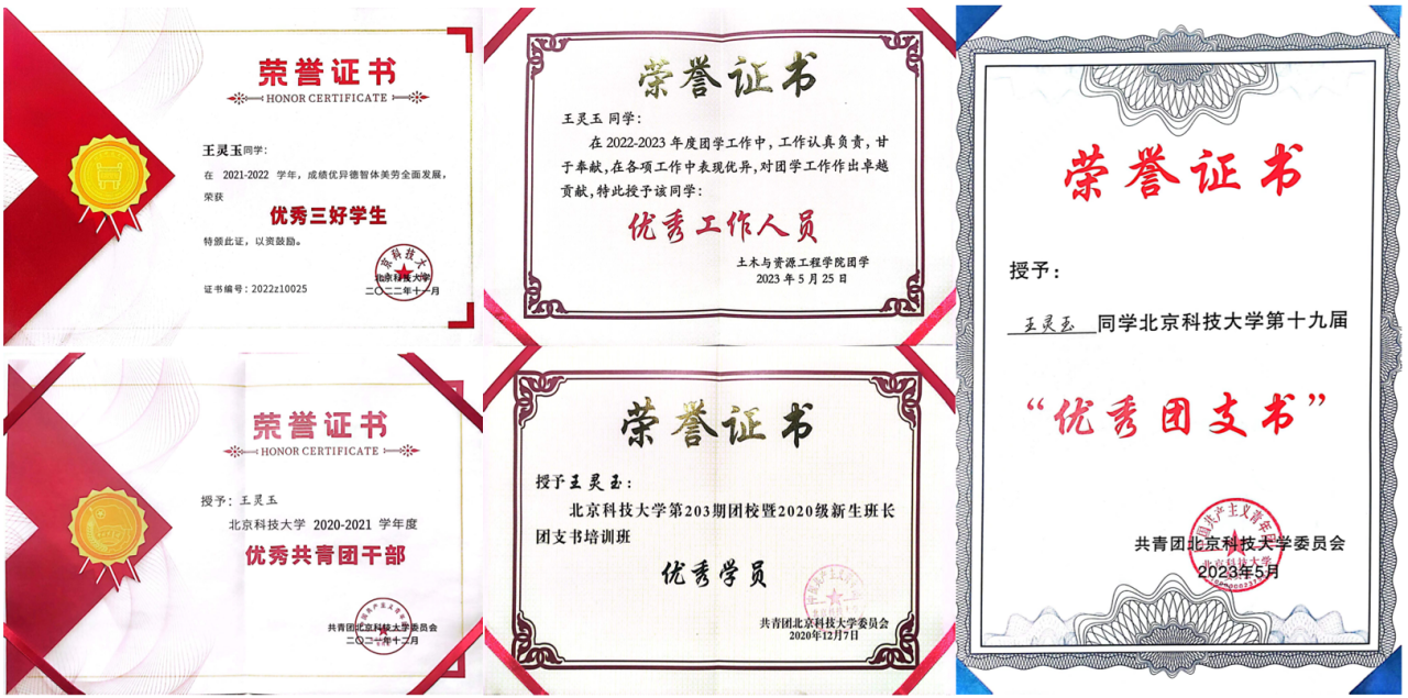 王灵玉,女,2001年7月生,北京科技大学土木与资源工程学院采矿工程专业2020级本科生,现已保研至北京科技大学攻读学术型硕士学位。获得国家奖学金、国家励志奖学金、安百拓奖学金等奖项;获得第二十四届“摇篮杯”大学生创新创业竞赛一等奖、第五届资源加工与清洁利用大赛一等奖、“青创北京”2023年挑战杯“青聚奇思”黑科技专项赛一等奖、第九届中国国际“互联网+”大学生创新创业北京赛区主赛道一等奖、第八届全国高等学校矿物加工工程专业学生实践作品大赛三等奖、第十二届全国高等学校采矿工程专业学生实践作品大赛三等奖等14项竞赛奖励;获评北京科技大学优秀三好学生、优秀共青团干部、第十九届优秀团支书等17项荣誉称号;所在班级获评校级先进班集体、优秀团支部。连续两年参与SRTP项目,在“深井高温隔热材料研究”项目中任队员,参与项目实验及项目研究报告的撰写;在“破裂砂岩多尺度孔隙结构探测表征与三维可视化研究”项目中任负责人并获国家级立项。曾担任土资学院团委组织部部长、学工办助管、矿业2003团支书等,现任矿业2302小班主任、采矿202团支书、先进院助管。