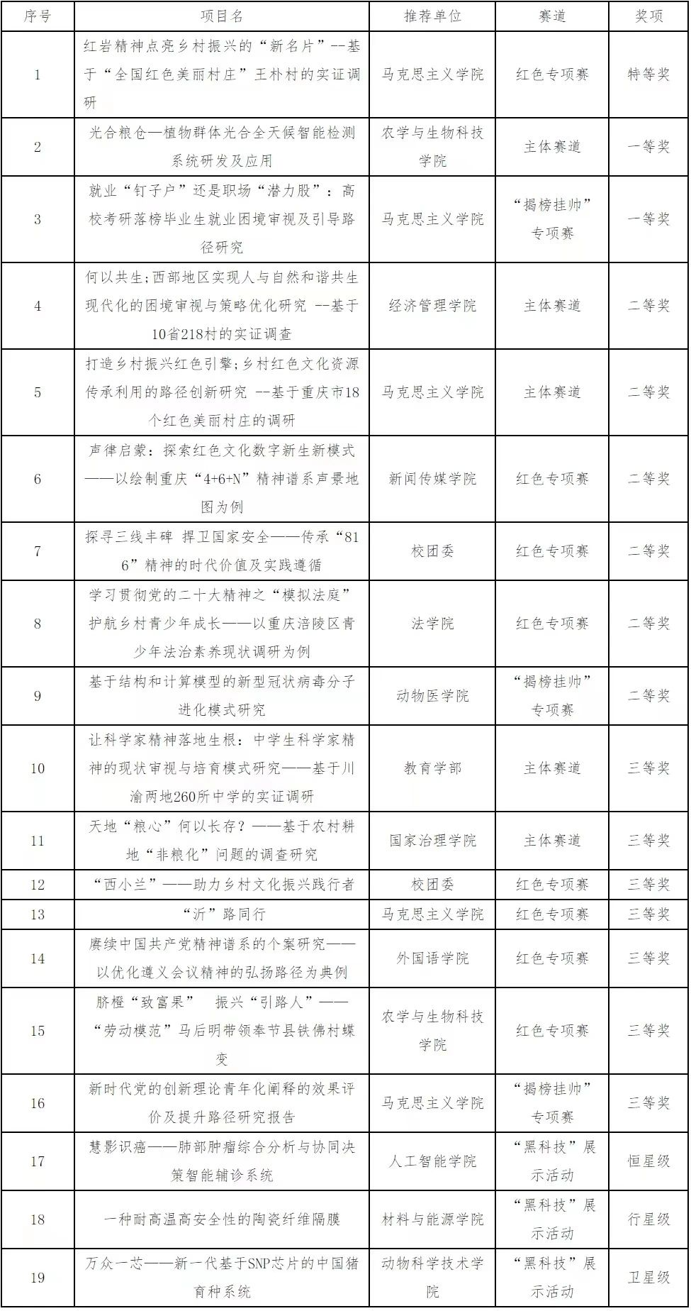 学校在红色专项赛中斩获特等奖1项,二等奖3项,三等奖4项;主体赛中斩获一等奖1项,二等奖2项,三等奖2项;“揭榜挂帅”专项赛中斩获一等奖1项、二等奖1项、三等奖1项;在“黑科技”展示活动中斩获“恒星”级、“行星”级、“卫星”级奖项各1项。