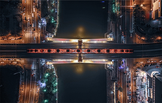 天津市红桥区,俯拍角度下的天津之眼横跨河面,来往的车辆在海河两岸穿梭。中青校媒记者 章子越/摄(山西大学)