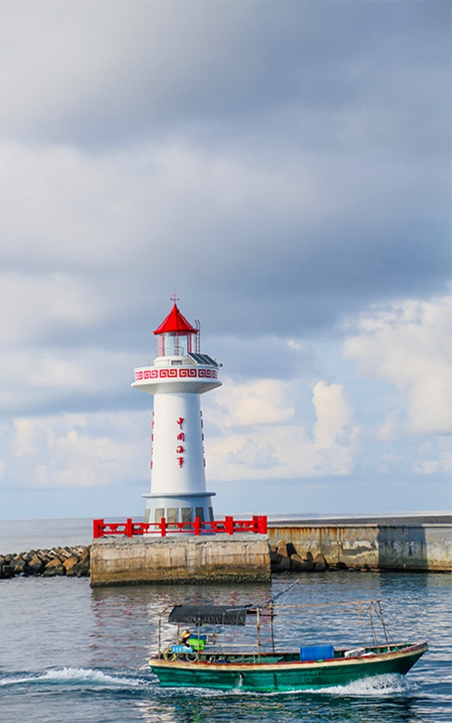 海南省三沙市永兴岛,当地渔民出海归港靠岸路过灯塔。中青校媒记者 郭正昊/摄(海南大学)