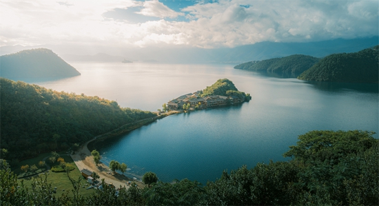 云南省丽江市宁蒗彝族自治县泸沽湖,封闭后的里格半岛在阳光的照耀下,好似吊坠一般镶嵌在泸沽湖面上。中青校媒记者 林鑫平/摄(安徽工业大学)