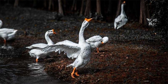 池塘边的白鹅挥动着翅膀。似乎在说,“春天,我来了。”中青校媒记者 李锋艺/摄(漳州职业技术学院)