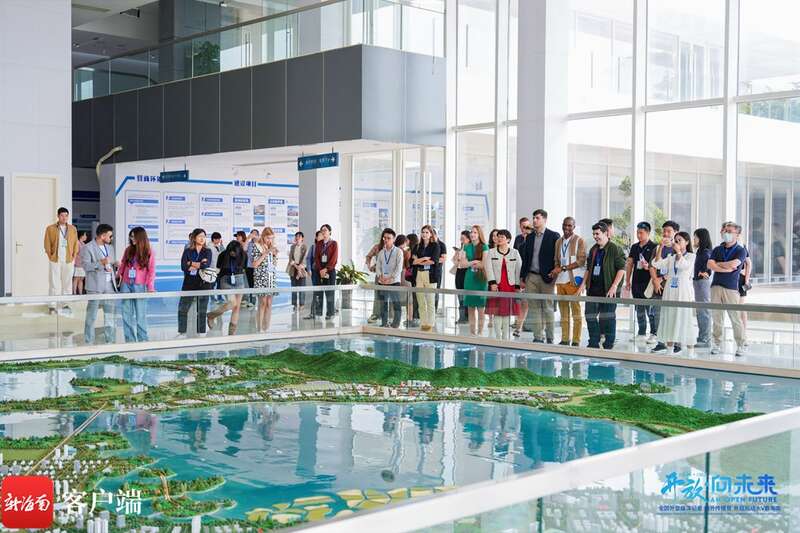 随后,一行人走进园区,“沉浸式”感受试验区的发展。站在教学楼顶楼,建设中的黎安国际教育创新试验区尽收眼底,远处新村潟湖水面波光粼粼,与岸边一栋栋现代化教学楼交相呼应,美丽的校园环境让采访团成员沉浸其中,“如果让我重新回到校园,我一定到这里上学。”来自湖南广播电视台国际频道的贾思德感慨。