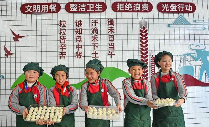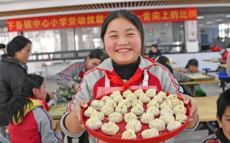 2023年11月28日,浙江省台州市,仙居县下各镇中心小学学生展示自己制作的“小笼包”。当日,浙江省台州市仙居县下各镇中心小学举办“舌尖上的比拼”劳动技能大赛活动,学生们按年级段分别进行“敲敲肉、包饺子和包小笼包”项目比赛,让学生们在学习厨艺、制作美食中,掌握更多生活技能,感受劳动的快乐。