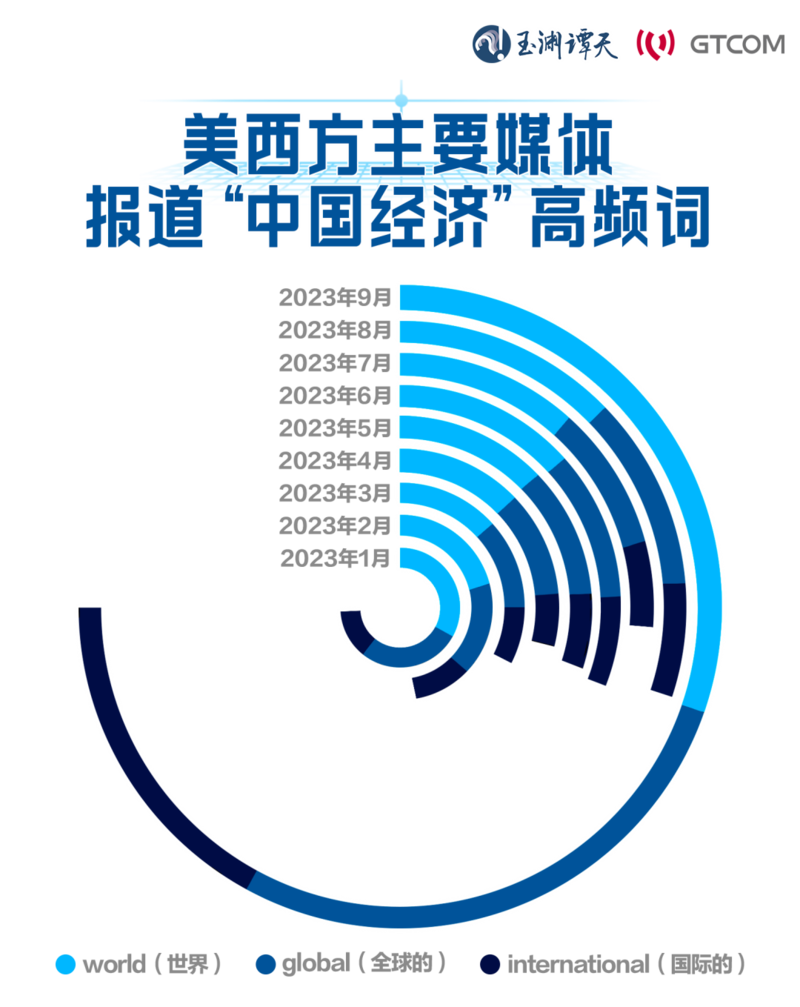 今年以来,外媒在关注中国经济时,一个典型特征,就是勾连中国经济与大环境的关系。谭主用大数据工具进行统计发现,1月至9月,外媒使用“世界”“全球的”“国际的”这三个词的频次在逐步增加。