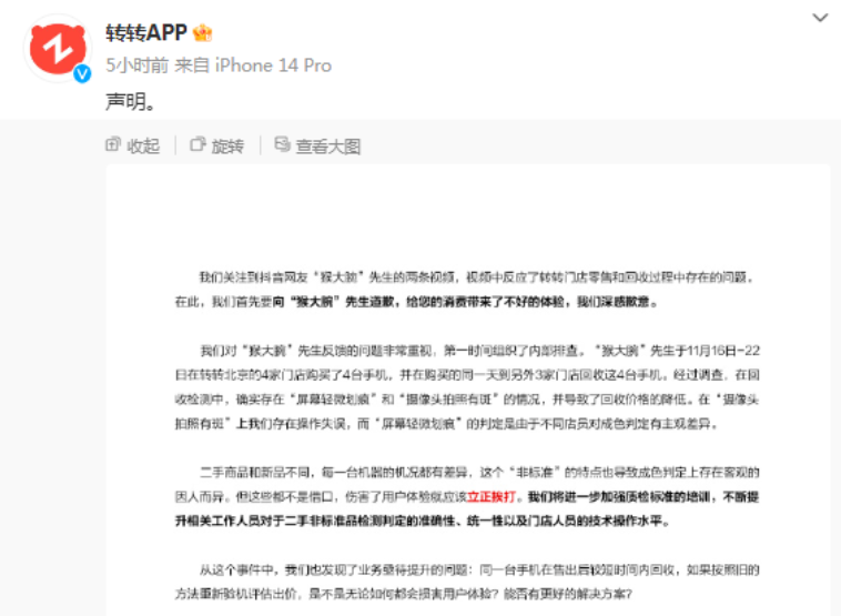 11月29日,@转转APP 发布声明,向博主“猴大腕”道歉并第一时间组织了排查,转转称经过调查,在回收检测中,确实存在“屏幕轻微划痕”和“摄像头拍照有斑”的情况,并导致了回收价格的降低。
