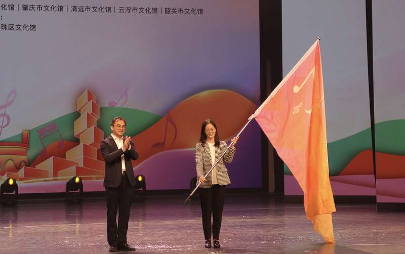 现场,组委会还进行了旗帜交接仪式,广州市文化广电旅游局党组成员、副局长张胜将“广佛肇清云韶”原创音乐作品展演的旗帜交给佛山市文化广电旅游体育局党组成员、副局长桂红。佛山成为下一届“广佛肇清云韶”原创音乐作品展演的东道主。