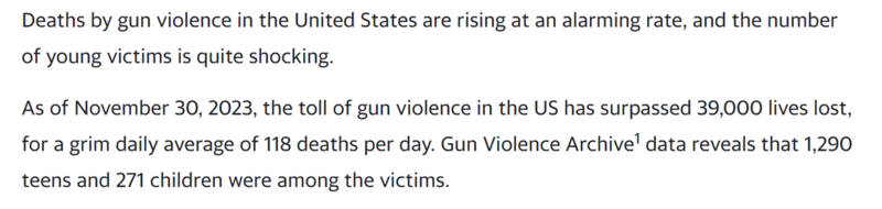 截至2023年11月30日,美国枪支暴力造成的死亡人数已经超过了3.9万人,平均每天有多达118人因此丧命。非营利组织“枪支暴力档案”(Gun Violence Archive)的数据还显示,在这些受害者中,青少年及儿童的人数分别为1290名和271名。