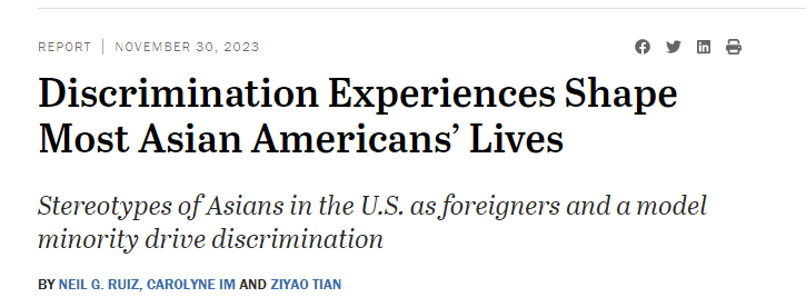 调查发现,37%受访者表示,自己曾被他人使用冒犯性称呼。此外,有五分之一的亚裔成年人表示,他们遭受过工作场所歧视。约十分之一的亚裔成年人表示,他们因种族被警察拦截、搜查或询问。