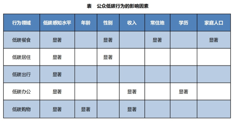 研究显示,低碳意识是影响低碳行为最关键的因素,低碳意识对低碳行为的促进作用具有显著的稳健性。随着低碳意识水平的提升,公众在餐食、居住、办公、出行和购物五大领域践行低碳行为的概率均有不同程度提高。因此,低碳知识的普及和对低碳行为有效性认知的提升,能够显著提高公众的低碳态度和行为意愿,进而促进公众践行低碳行为。在外部因素方面,低碳生活配套措施和服务还不健全,低碳信息和激励措施相对缺乏会影响公众践行低碳行为。
