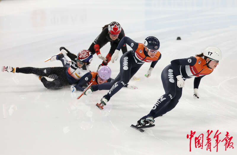 12月10日,北京首都体育馆,2023-2024赛季国际滑联短道速滑世界杯北京站,女子500米半决赛第一组上演戏剧性的一幕,连续4枪都有选手摔倒,直到第5次鸣枪才完赛。中青报·中青网记者 曲俊燕/摄