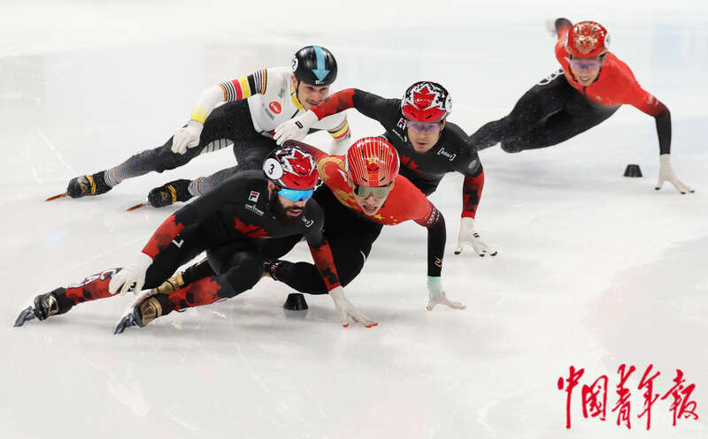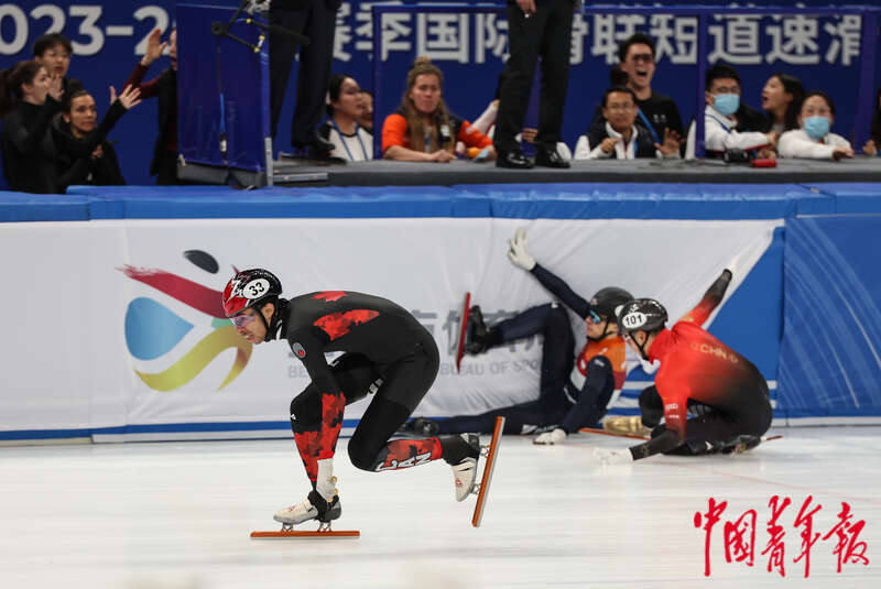 12月10日,北京首都体育馆,2023-2024赛季国际滑联短道速滑世界杯北京站,男子5000米接力决赛,中国选手任子威与荷兰选手在最后冲刺阶段摔出赛道,加拿大选手随后第一个冲过终点。中国队获得铜牌。中青报·中青网记者 曲俊燕/摄