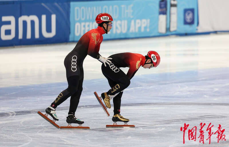 12月10日,北京首都体育馆,2023-2024赛季国际滑联短道速滑世界杯北京站,中国选手刘少昂(前右)获得男子1000米决赛冠军后与队友拥抱。当日,2023-2024赛季国际滑联短道速滑世界杯北京站进入最后一个比赛日,除男子1000米决赛夺金外,另外三名中国选手范可新、公俐、孙龙分别获得女子500米、女子1000米、男子1000米铜牌,由刘少昂、刘少林、任子威、孙龙组成的中国队获得5000米接力的铜牌。本次北京站赛事的部分项目于9日进行了第一次决赛,10日进行第二次决赛。在两天的比赛中,中国队一共收获1金4银5铜。中青报·中青网记者 曲俊燕/摄
