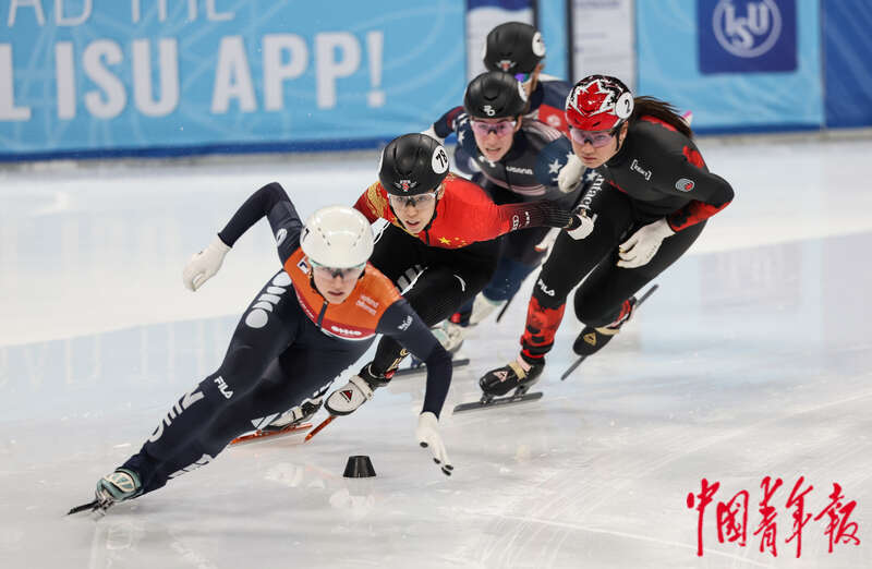 12月10日,北京首都体育馆,2023-2024赛季国际滑联短道速滑世界杯北京站,范可新(前二)在女子500米1/4决赛中。中青报·中青网记者 曲俊燕/摄