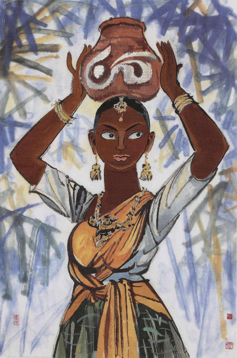 教师作品《顶罐女》,彩锦绣,78×52cm,2018。设计:张仃;绣制:姜幸民。