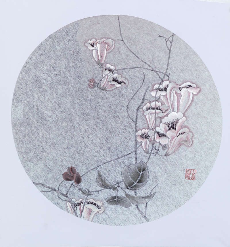 学员作品《凝香》,仿真绣,直径40cm,2023。原作:肖晶;绣制:沈慧娟。
