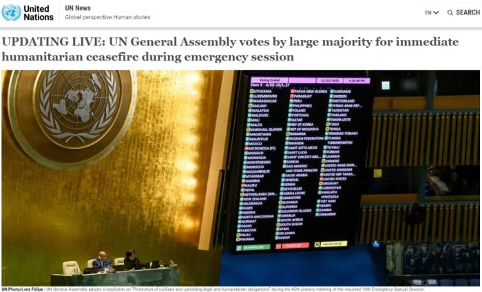 中新网12月13日电 据联合国新闻网消息,当地时间12日,联合国大会针对巴以冲突召开紧急会议,并讨论了一项呼吁加沙立即实现人道主义停火的决议。