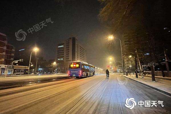 北京海淀今晨降雪持续,路面湿滑。(图/中国天气网 王晓)