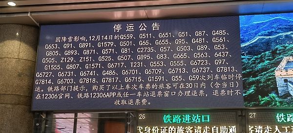 2023年12月14日,北京西站、北京丰台站部分列车临时停运,截至目前,北京西站有开往石家庄、郑州、西安、武汉等方向的49趟列车停运,北京丰台站有开往石家庄、太原南等方向的11趟列车停运。