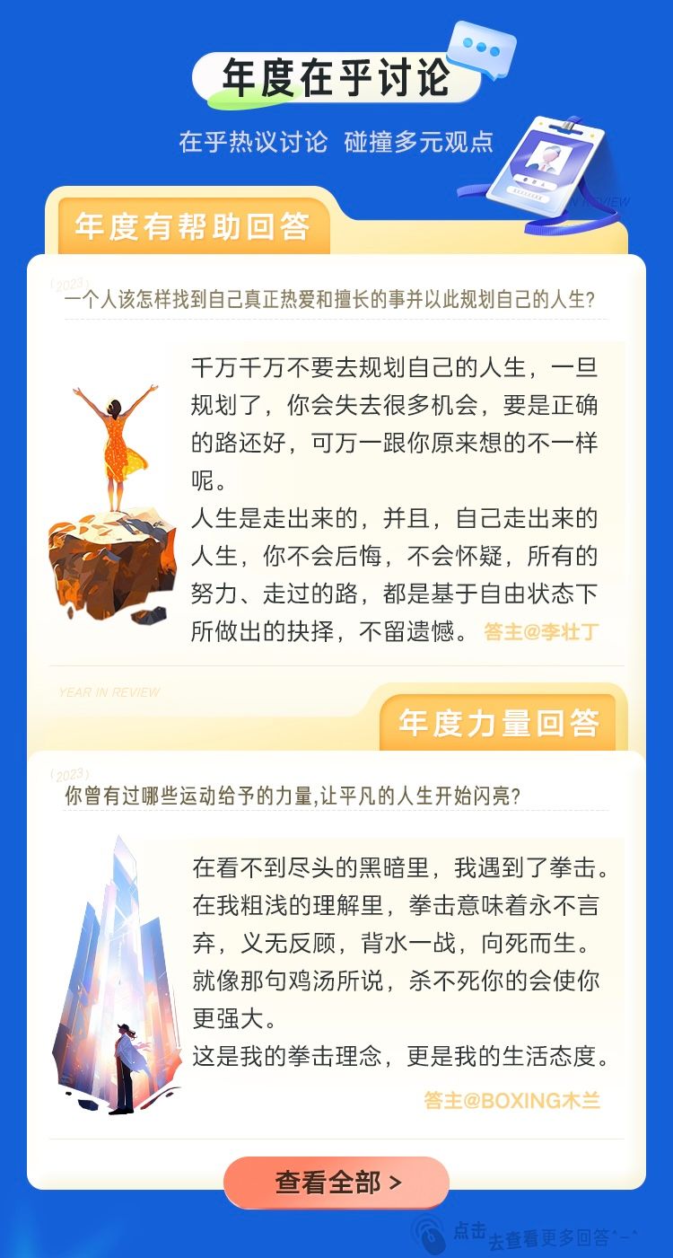 “年度在乎讨论”里则涵盖了全年有帮助、有力量的回答和想法。例如,拳击手、知乎答主“Boxing木兰”在问题“你曾有过哪些运动给予的力量,让平凡的人生开始闪亮”,写下她对拳击的感悟,“在看不到尽头的黑暗里,我遇到了拳击。在我粗浅的理解里,拳击意味着永不言弃,义无反顾,背水一战,向死而生”。