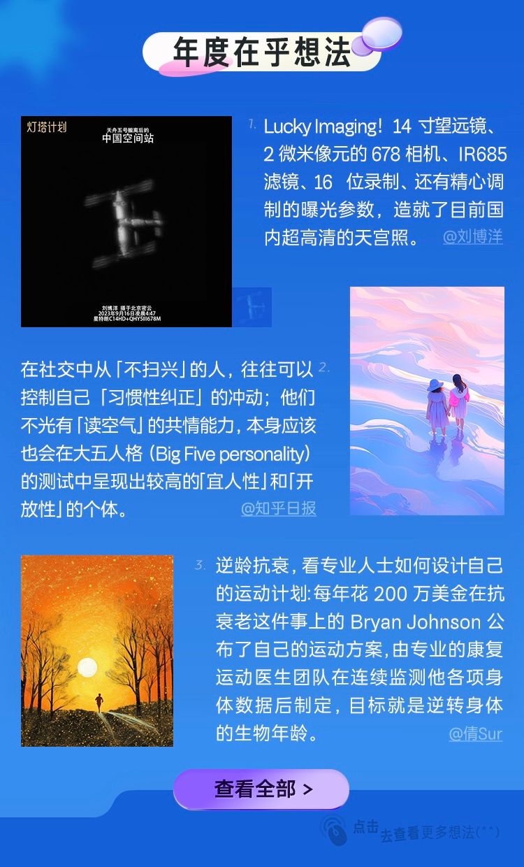 知乎想法内容,呈现出用户真实、鲜活、灵光一现的所见所想。西澳大学天体物理博士、知乎天文学话题优秀答主刘博洋拍摄的目前国内最清晰的天宫照登榜,此外还有市井烟火、壁画等优秀想法内容。