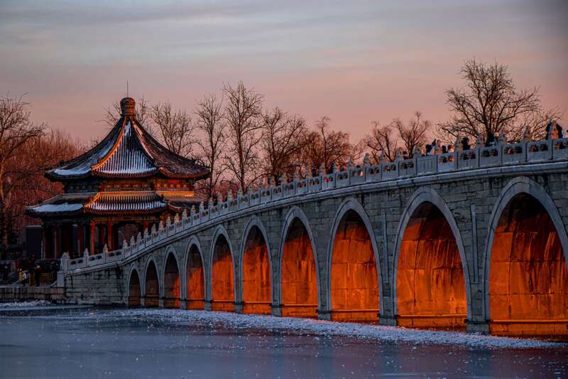 12月22日,冬至,北京颐和园十七孔桥出现“金光穿洞”景象,吸引大量游客前来观看。 (清华大学学生孙浩竣 摄)
