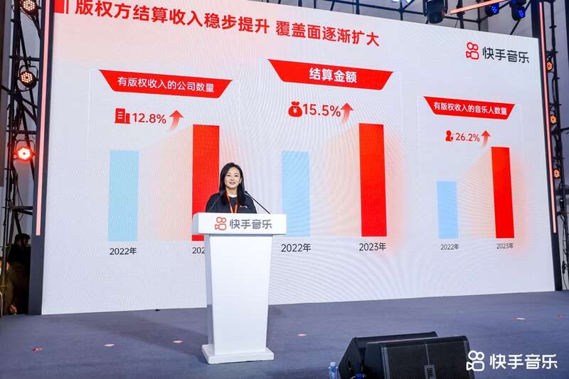 快手音乐中心负责人于蓝表示,2023年,平台累计已为30家版权方促成了歌曲商业化场景合作,版权方音乐结算的总金额同比上涨15.5%。