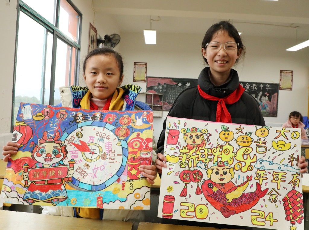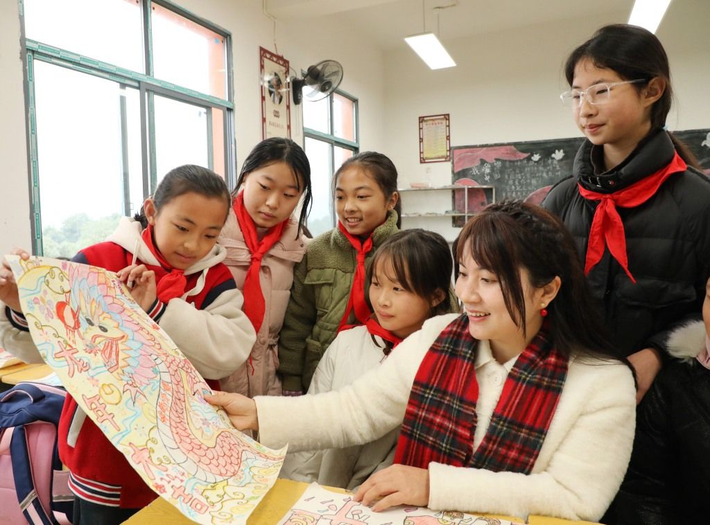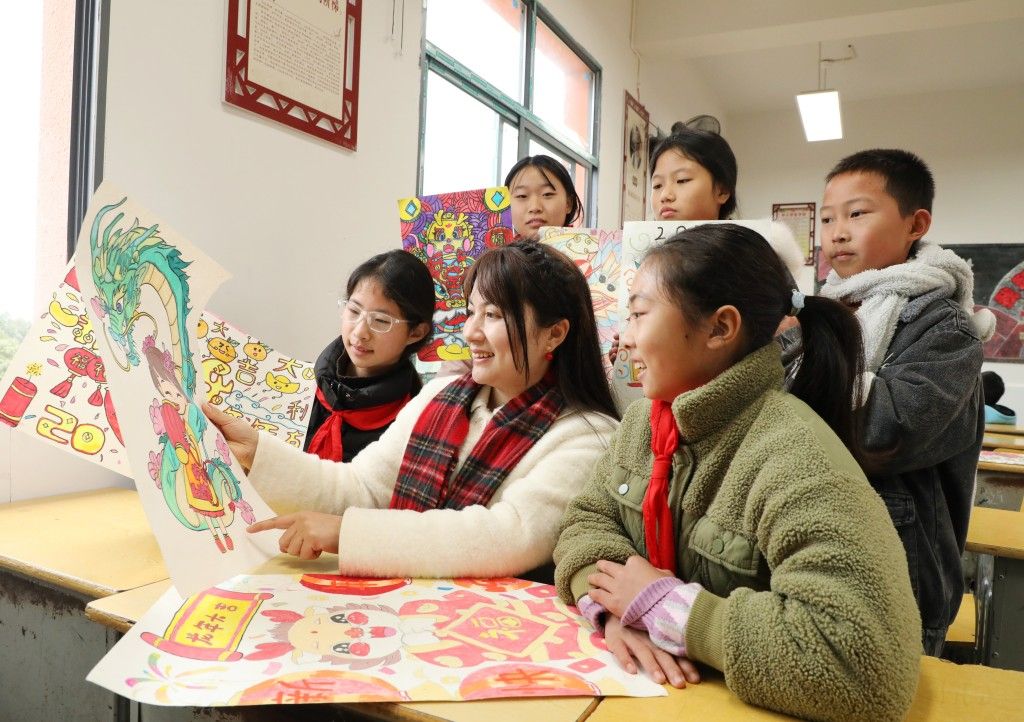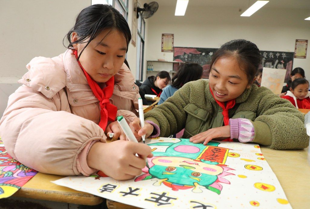 2023年12月27日,在湖南省保靖县清水坪学校,老师指导学生绘制年画,体验绘画的乐趣。元旦将至,该校组织师生开展剪窗花、绘年画、学习传统文化等活动,不仅让孩子学到丰富的节日文化知识,丰富课余文化生活,增进他们对传统民俗文化的了解,喜迎新年的到来。