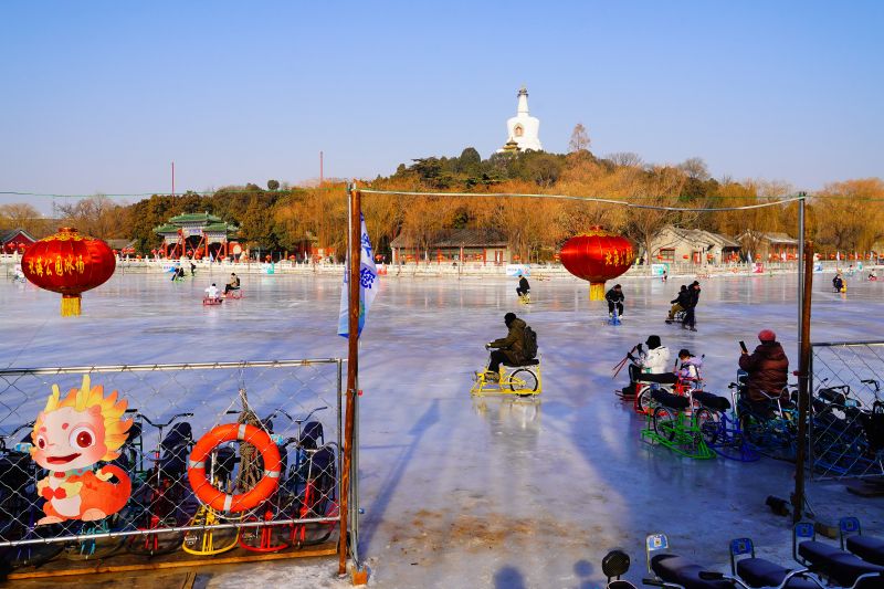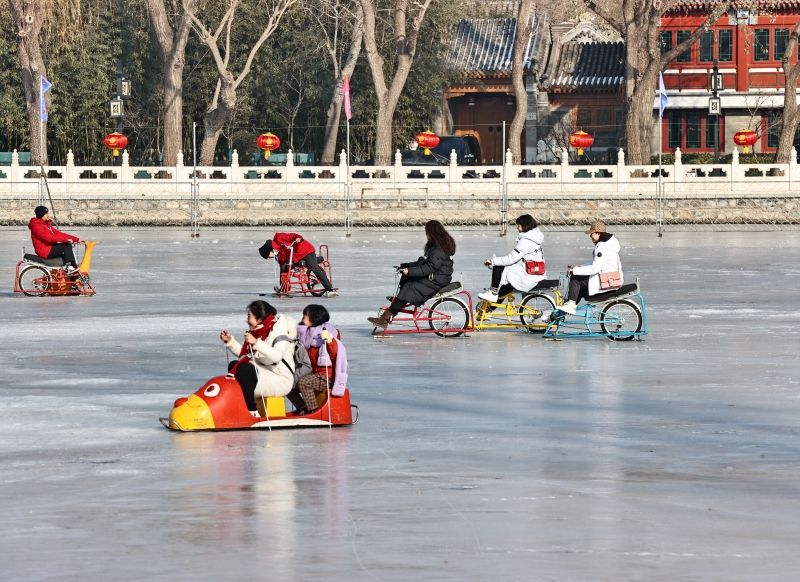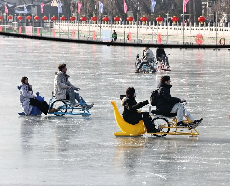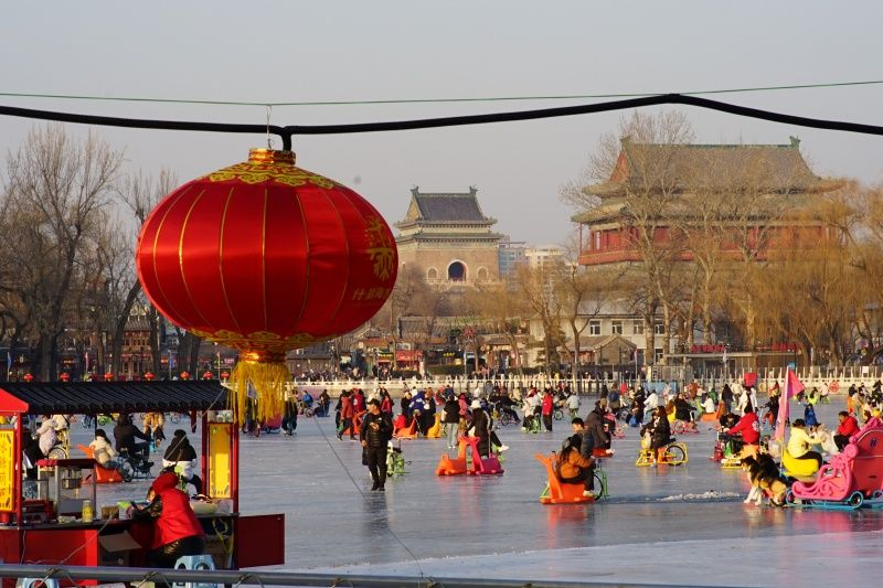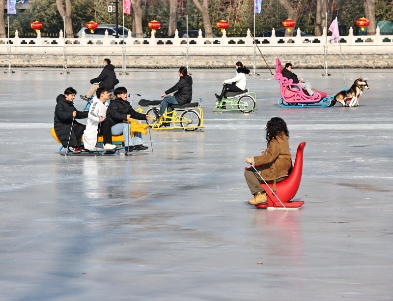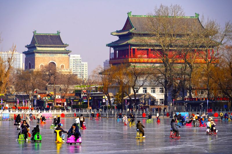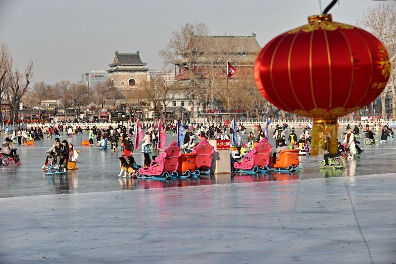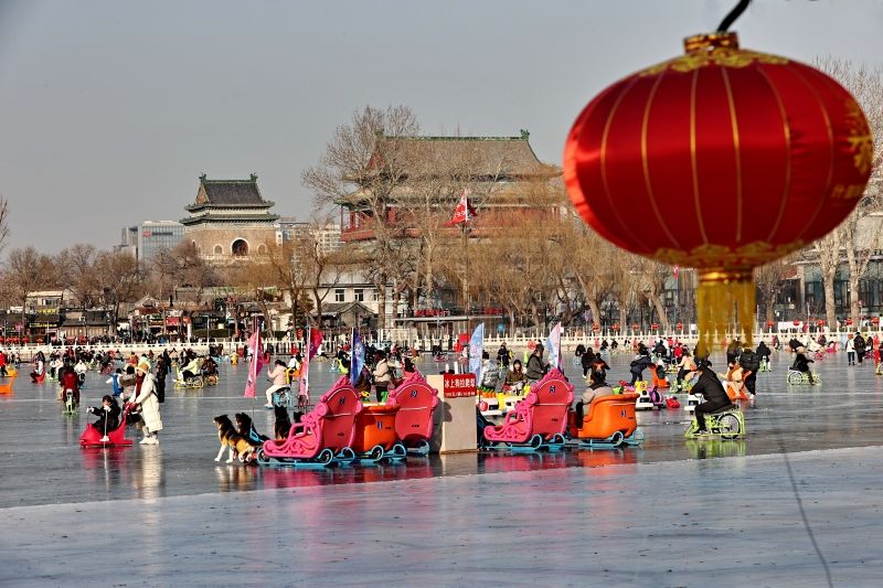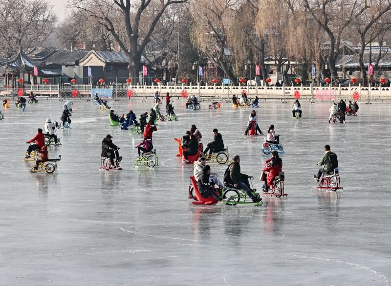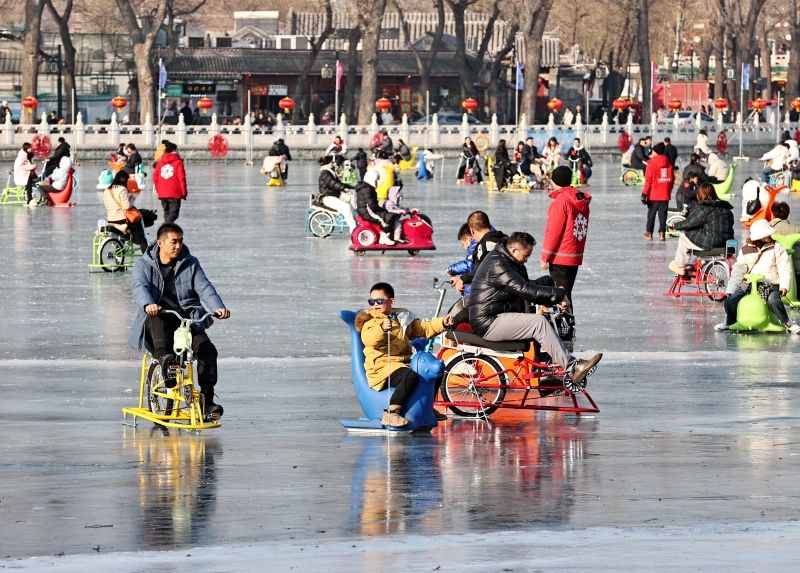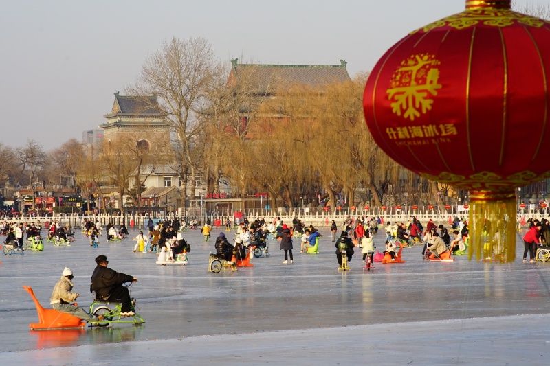 2023年12月28日,北京,什刹海冰场试运营,吸引不少市民来此享受冰上运动带来的乐趣。2023年,什刹海冰场的开放区域达到16万平方米,除了往年常设的单双人冰车、冰上自行车区域及速滑区,还增设了近5000平方米的滑冰培训区,配备专业滑冰教练员。每年冬天去什刹海溜冰滑冰车,是很多北京人的童年记忆,也是冬季来北京必打卡的游玩项目。画面中滑冰的市民与远处钟鼓楼同框,老北京韵味十足。