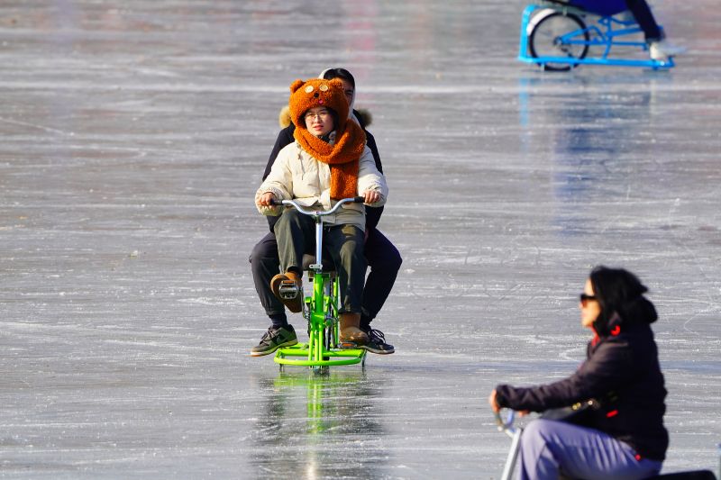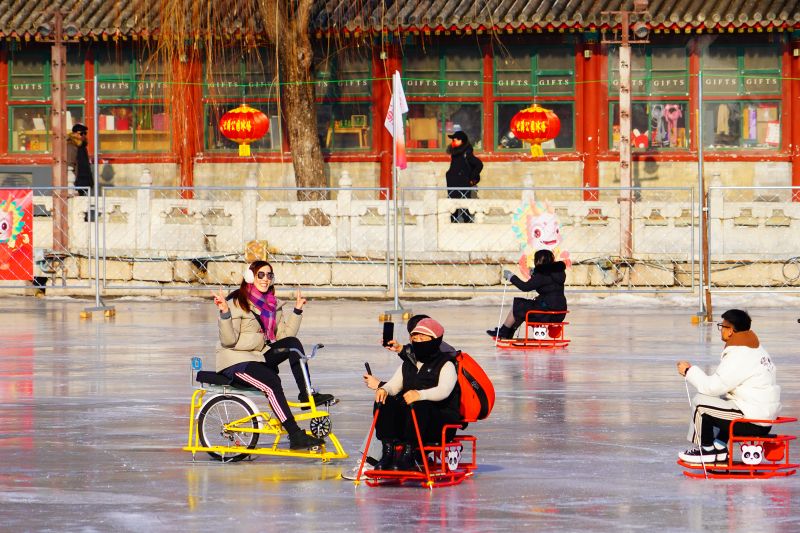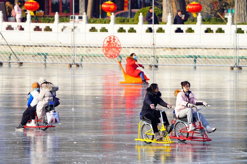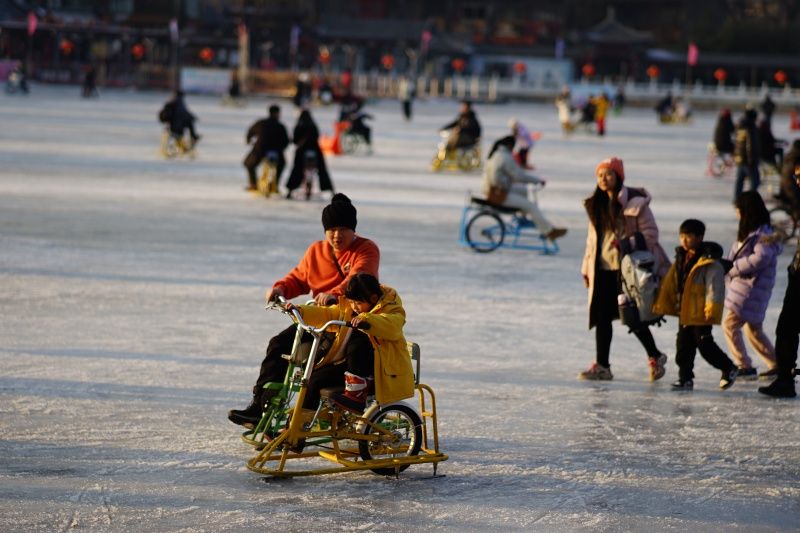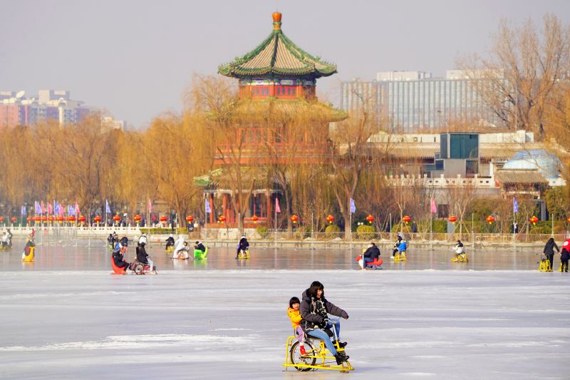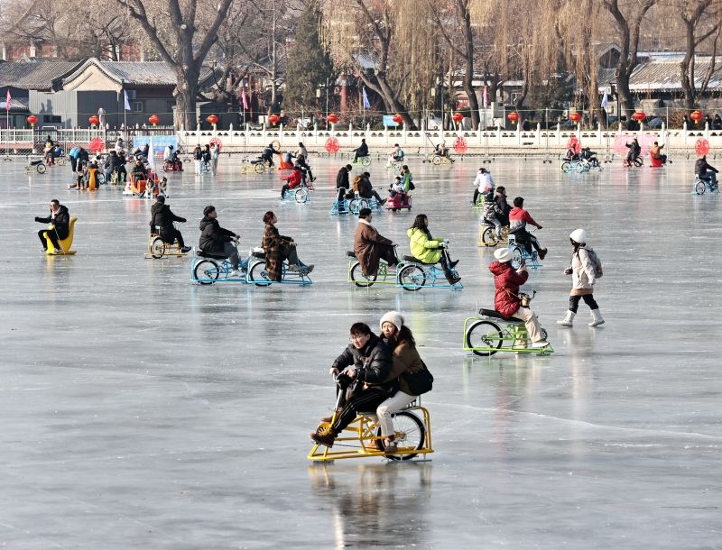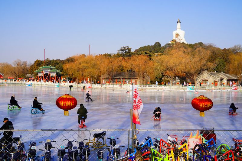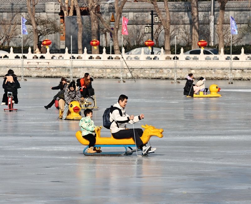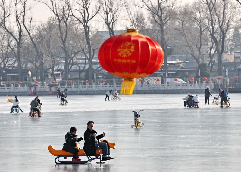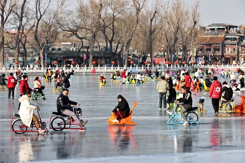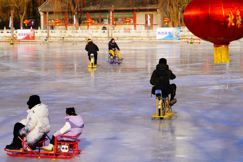 2023年12月28日,北京,什刹海冰场试运营,吸引不少市民来此享受冰上运动带来的乐趣。2023年,什刹海冰场的开放区域达到16万平方米,除了往年常设的单双人冰车、冰上自行车区域及速滑区,还增设了近5000平方米的滑冰培训区,配备专业滑冰教练员。每年冬天去什刹海溜冰滑冰车,是很多北京人的童年记忆,也是冬季来北京必打卡的游玩项目。画面中滑冰的市民与远处钟鼓楼同框,老北京韵味十足。