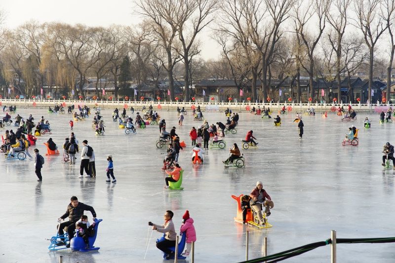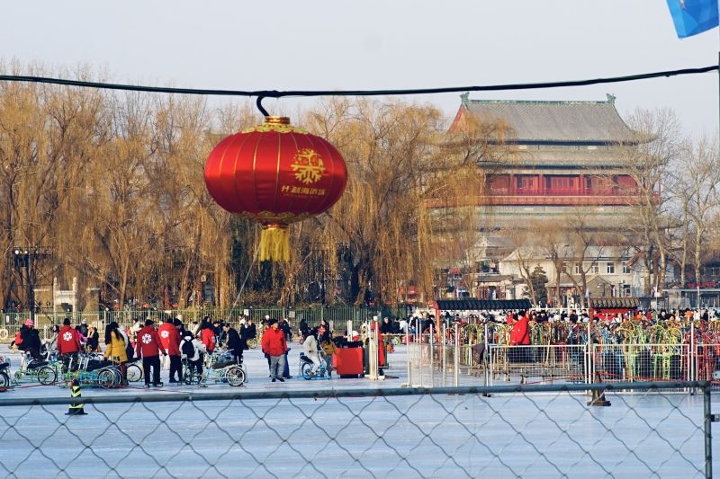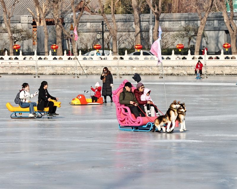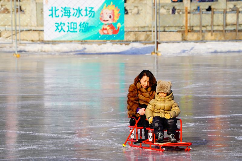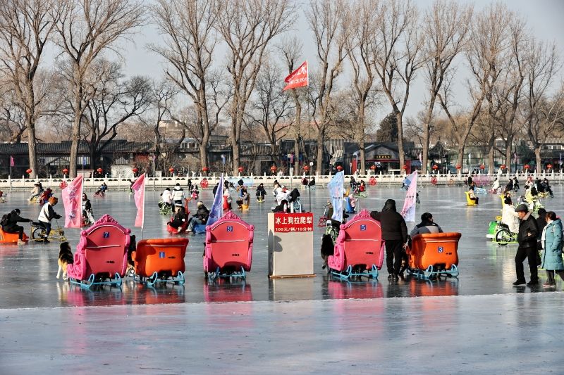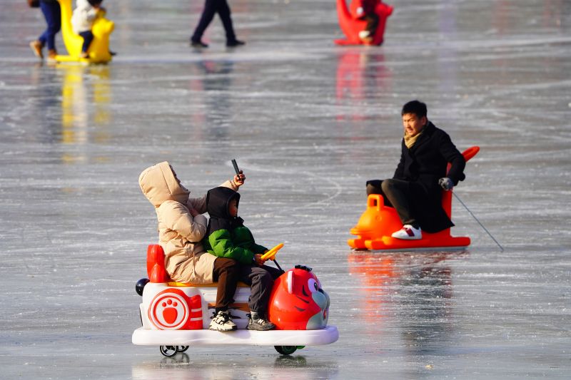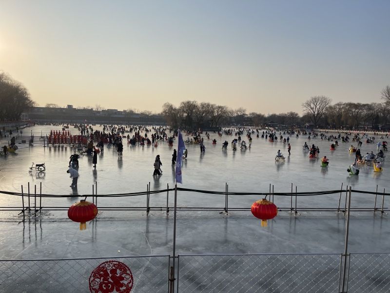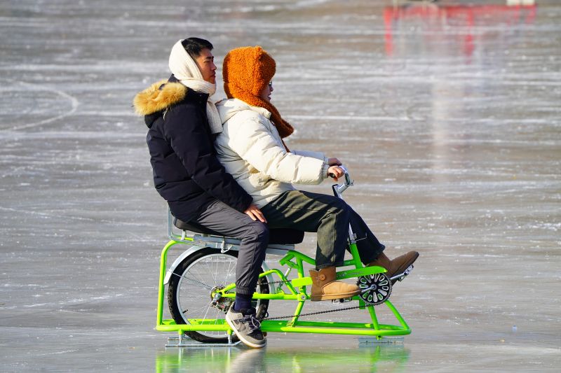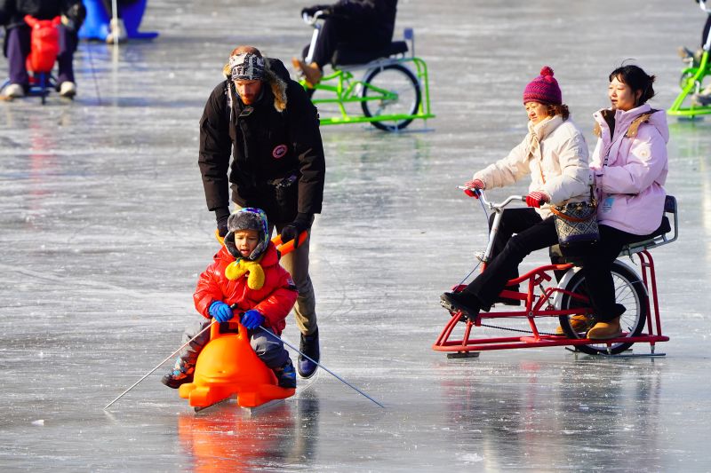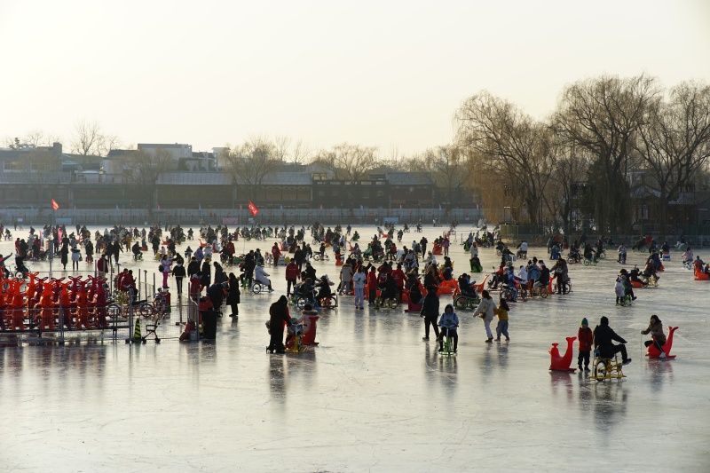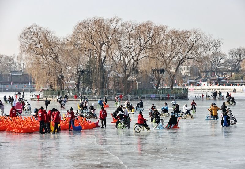2023年12月28日,北京,什刹海冰场试运营,吸引不少市民来此享受冰上运动带来的乐趣。2023年,什刹海冰场的开放区域达到16万平方米,除了往年常设的单双人冰车、冰上自行车区域及速滑区,还增设了近5000平方米的滑冰培训区,配备专业滑冰教练员。每年冬天去什刹海溜冰滑冰车,是很多北京人的童年记忆,也是冬季来北京必打卡的游玩项目。画面中滑冰的市民与远处钟鼓楼同框,老北京韵味十足。