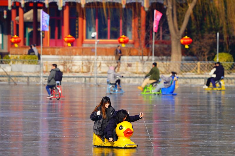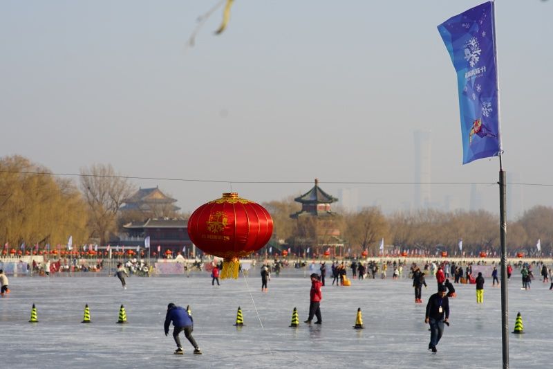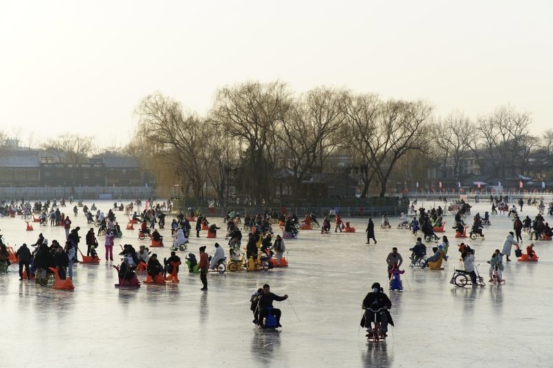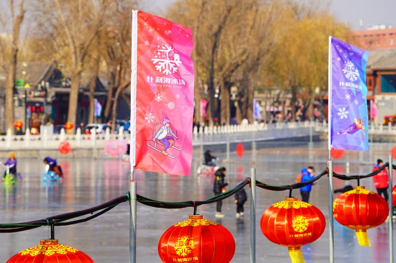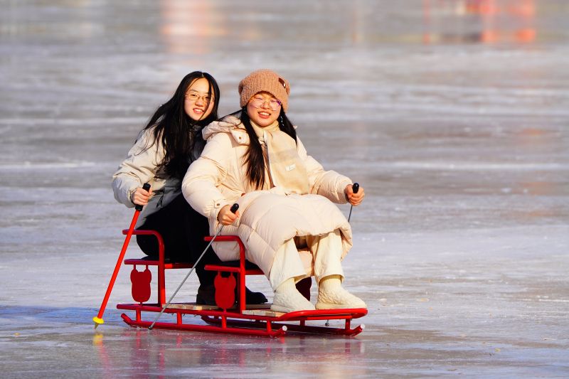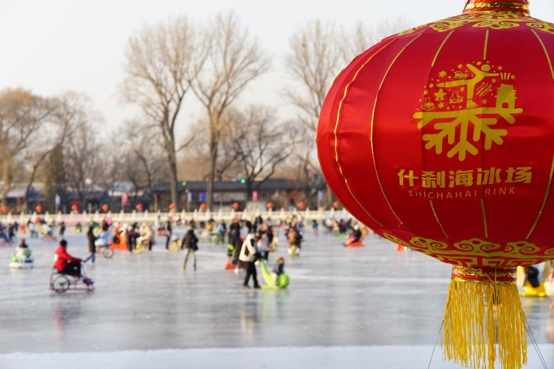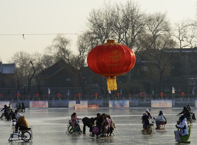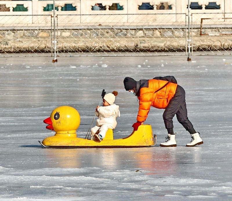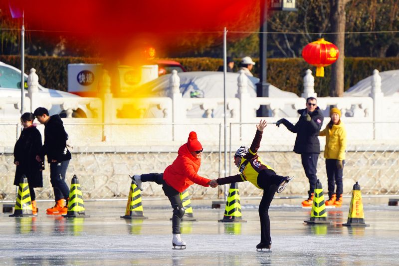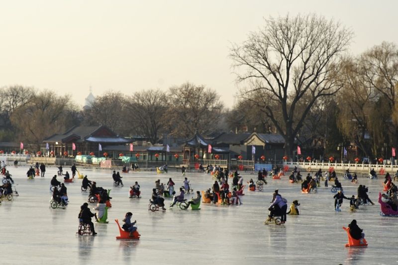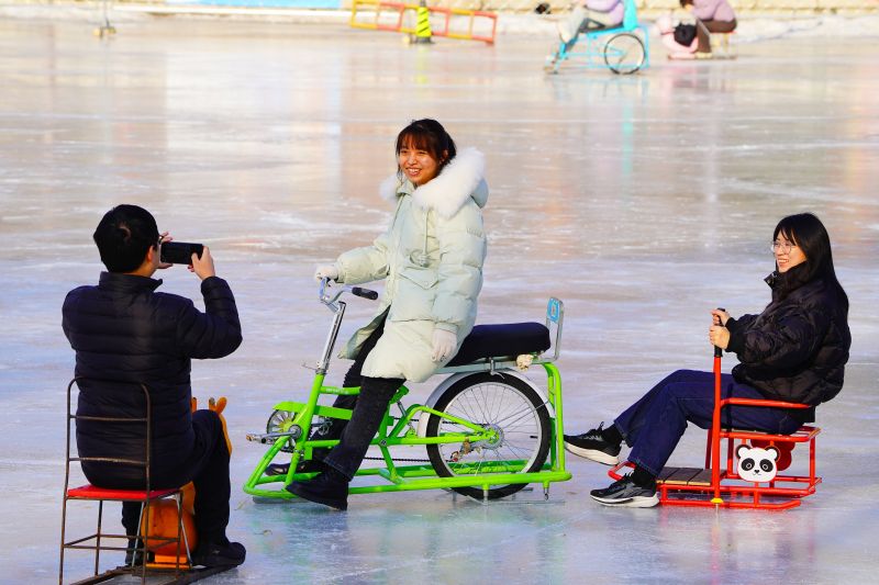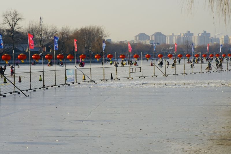 2023年12月28日,北京,什刹海冰场试运营,吸引不少市民来此享受冰上运动带来的乐趣。2023年,什刹海冰场的开放区域达到16万平方米,除了往年常设的单双人冰车、冰上自行车区域及速滑区,还增设了近5000平方米的滑冰培训区,配备专业滑冰教练员。每年冬天去什刹海溜冰滑冰车,是很多北京人的童年记忆,也是冬季来北京必打卡的游玩项目。画面中滑冰的市民与远处钟鼓楼同框,老北京韵味十足。