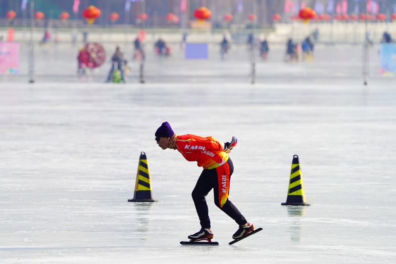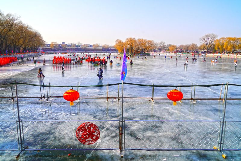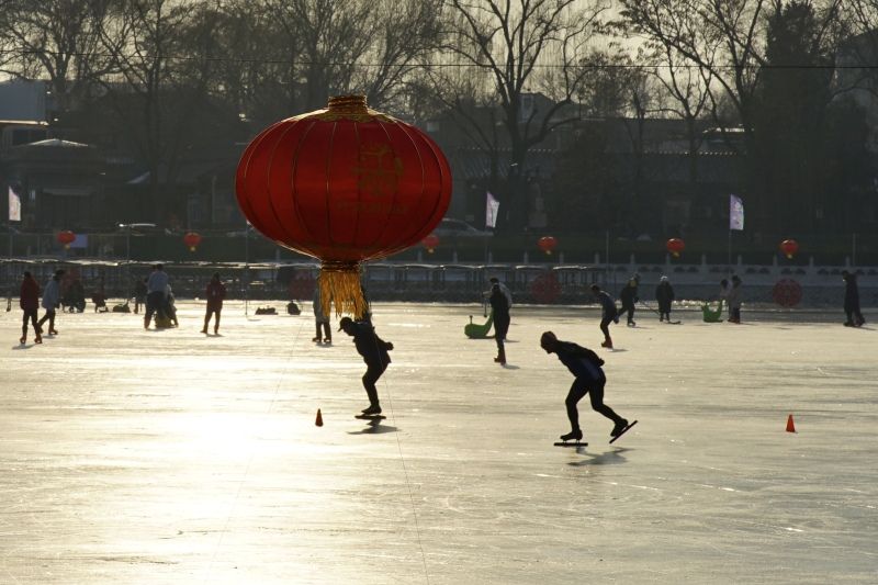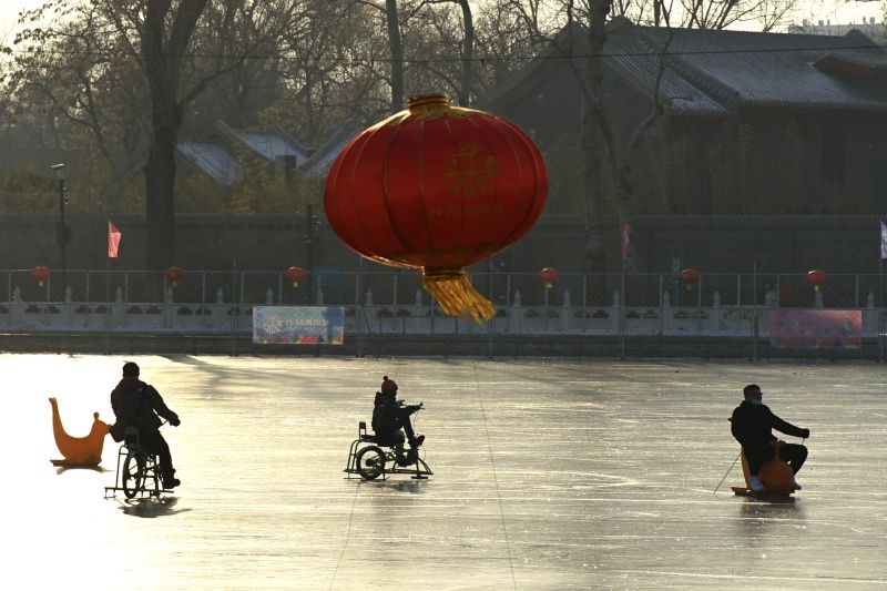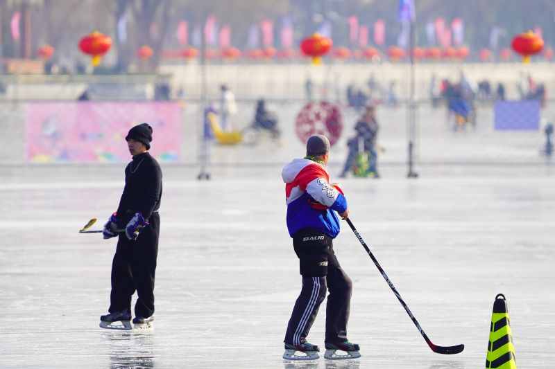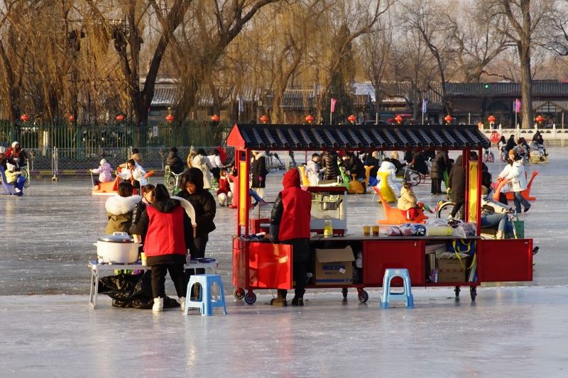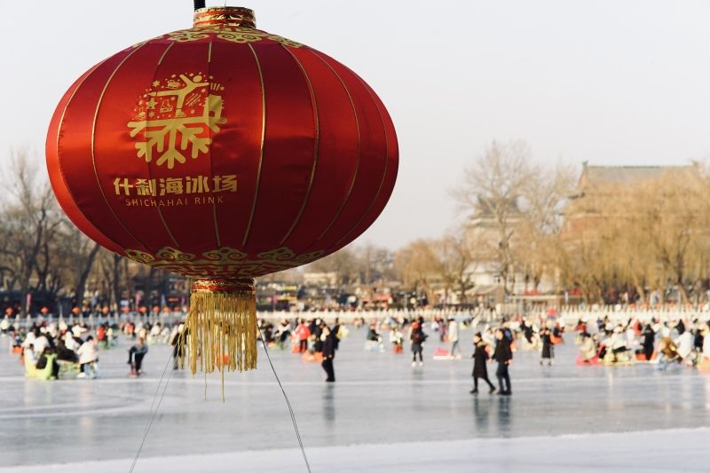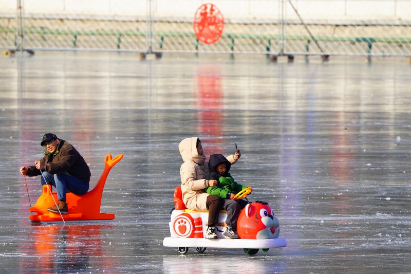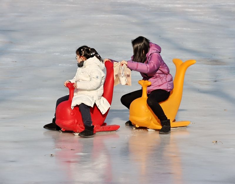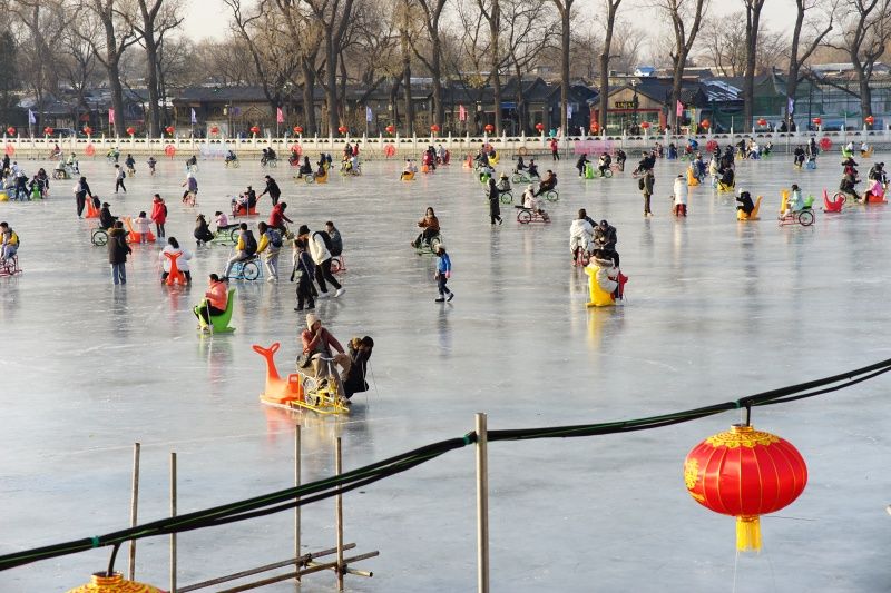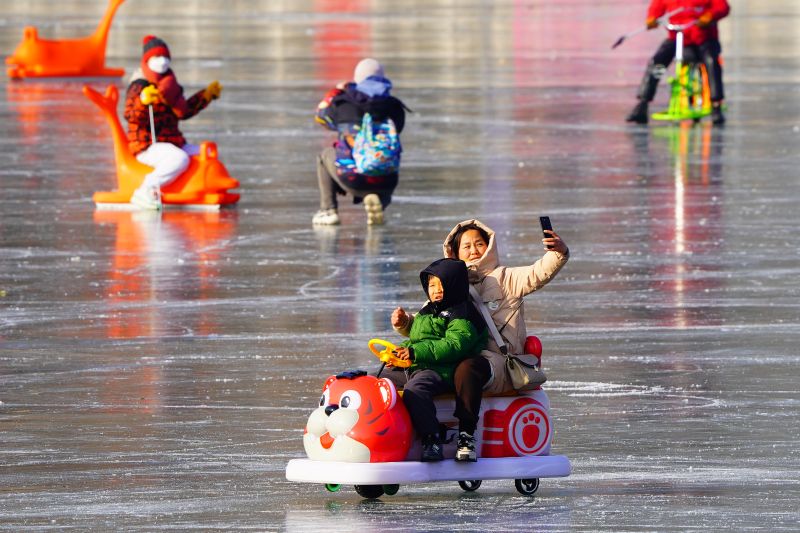 2023年12月28日,北京,什刹海冰场试运营,吸引不少市民来此享受冰上运动带来的乐趣。2023年,什刹海冰场的开放区域达到16万平方米,除了往年常设的单双人冰车、冰上自行车区域及速滑区,还增设了近5000平方米的滑冰培训区,配备专业滑冰教练员。每年冬天去什刹海溜冰滑冰车,是很多北京人的童年记忆,也是冬季来北京必打卡的游玩项目。画面中滑冰的市民与远处钟鼓楼同框,老北京韵味十足。