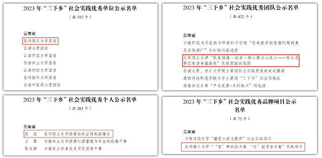 2023年,我校社会实践育人工作扎实推进、成效显著。通过开展系列“返家乡”“三下乡”社会实践活动,覆盖“寻根中国红 传承红色基因——追溯红色文化活动”“深植泥土黄 赋能乡村振兴——社会调研活动”“发掘希望绿 走绿色发展道路——环保科普活动”“挖潜专业蓝 助力农户大丰收——科技助农活动”“点燃昆工红 民族团结心连心——民族团结活动”五个层面。活动先后被人民日报、云南日报、中青网等多家主流媒体宣传报道300余次,撰写调研报告100余篇,实践报告5000余份。