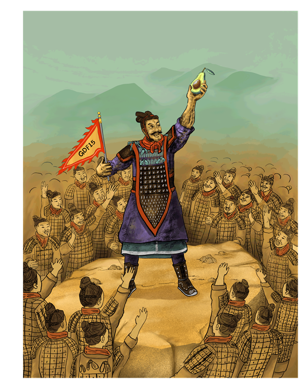 受邀创作杂志封面 (创作灵感:封面以被誉为“世界第八大奇迹”的兵马俑为主体,描绘了一幅西北地区将士热烈集会的场景,兵马俑将军发现以牛油果为代表的生 酮 饮食能够显著升高机体GDF15水平,他兴奋的号召士兵们跟随他的脚步,深入探究GDF15的分泌和产生)