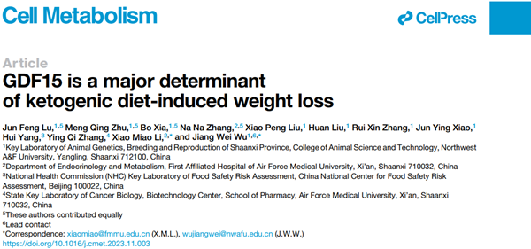 我校为本研究第一单位,动科学院博士研究生卢军锋、已毕业硕士朱梦清、夏博副教授及西京医院内分泌科张娜娜医生为本文的共同第一作者,动科学院吴江维教授、西京医院内分泌科李晓苗主任为本文 共同通讯作者。国家食品安全风险评估中心杨辉副研究员、空军军医大学张英起教授对本研究做出了重要贡献。剑桥大学Sir Stephen O’Rahilly及David B. Savage教授、加拿大麦克马斯特大学 Gregory R. Steinberg教授等对本研究提出了宝贵的建议与意见。本研究得到 国家重点研发计划、国家自然科学基金、陕西省创新人才推进计划等项目资助。团队带头人杨公社教授为该项目的顺利实施提供团队支撑和资金支持。