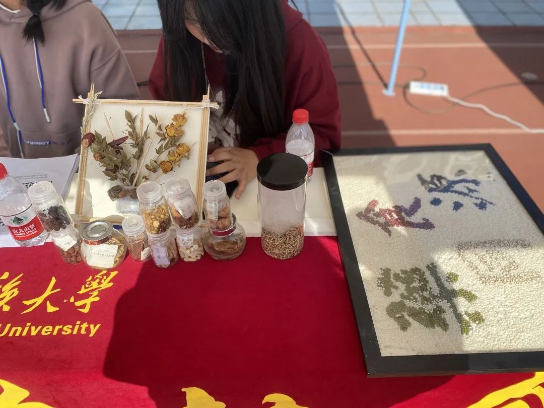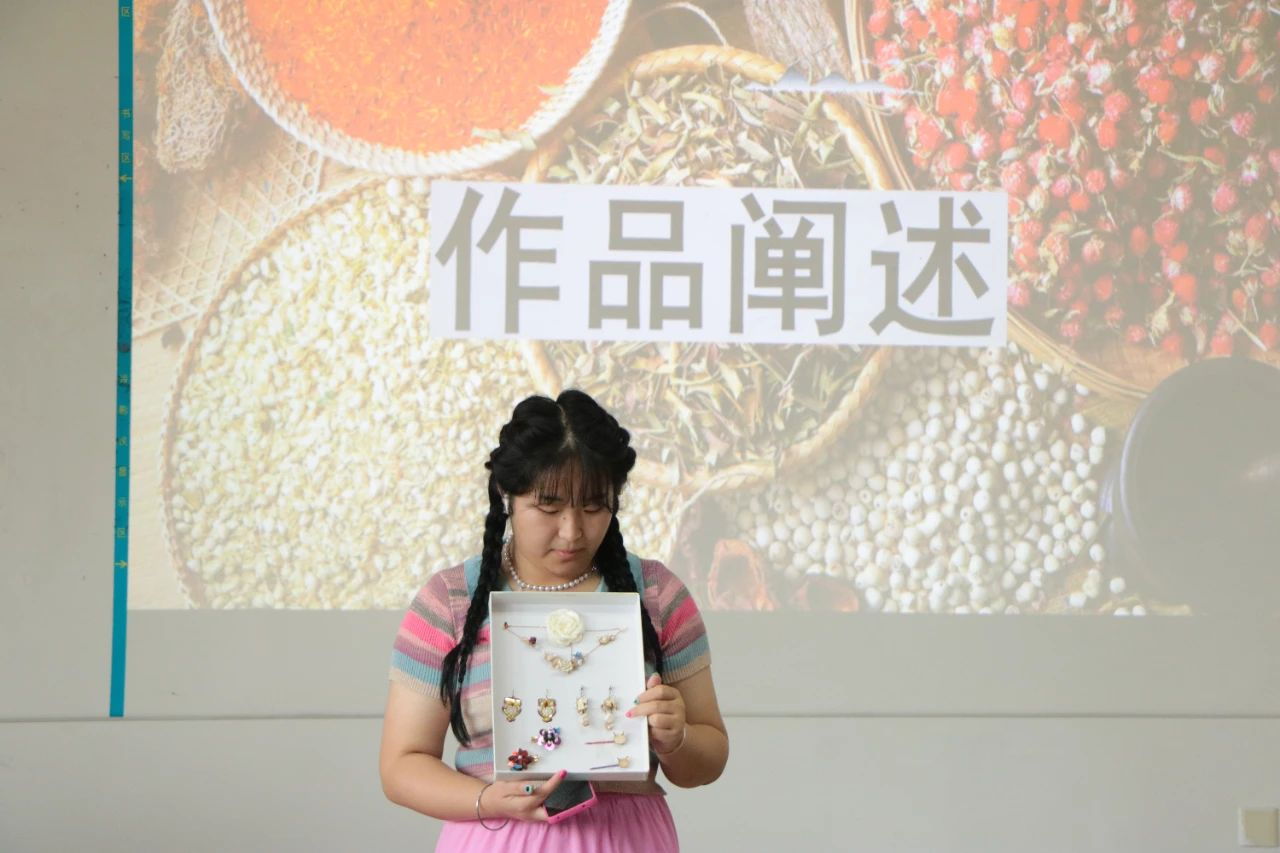 枸杞、菊花等药材拼成的“从百草园到三味书屋”,干柠檬片和珍珠制成的耳环,红枣和草药制成的花束……不同学院的学生利用专业知识,将药材与独特的设计结合起来,碰撞出学科交叉融合的火花。