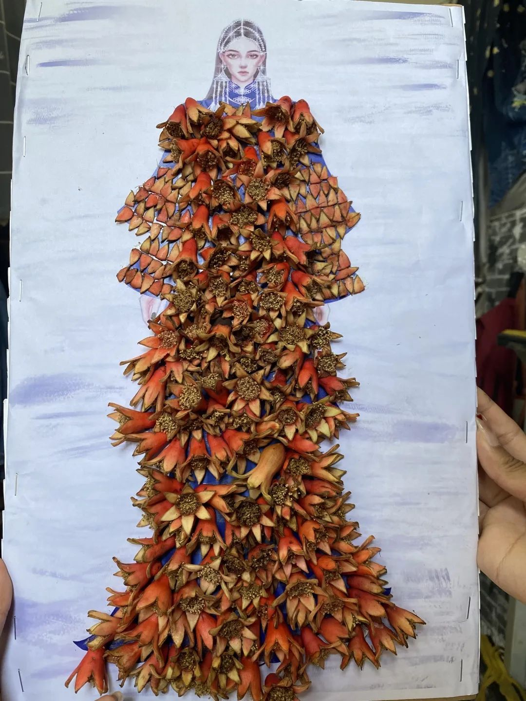 说干就干,两人捡了100余朵石榴花带回宿舍。作品以彝族少女服饰为基础,将石榴花分成“披肩”和“裙身”两部分。4个小时过去了,一位穿着金黄色长裙、飘着淡淡花香的姑娘,呈现在眼前。为了让设计看起来更有层次感,两人还买来了石榴,把石榴皮剪成三角形,做了一件“披风”。在给作品命名时,木坡曲洛说:“就叫她‘石榴姑娘’吧,寓意着民族团结的‘石榴花’常开常盛。”