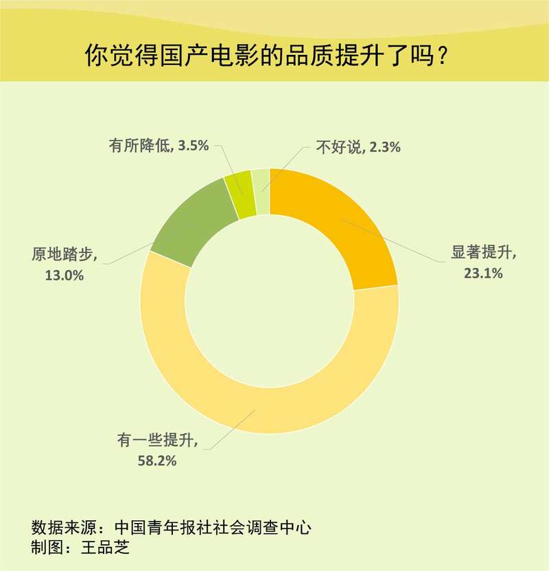 调查中,81.3%的受访者觉得国产电影的品质提升了,其中23.1%的受访者觉得显著提升。