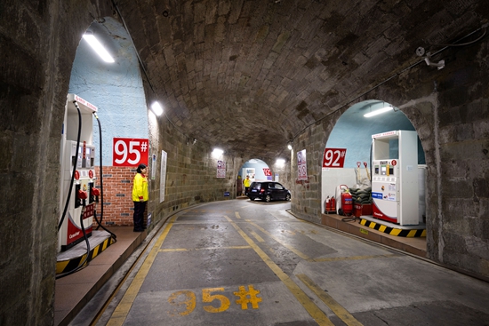 2023年11月8日,重庆桂花园加油站,加油机分置洞壁两侧,车辆从防空洞口驶入洞内加油,再从另一边洞口驶出。