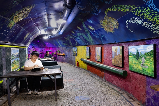 2023年11月9日,重庆“石头房子艺术空间”,用涂鸦、绘画、灯光等元素打造的空间吸引着众多市民前往看书、喝茶、赏画。