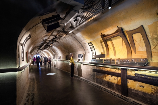 2023年11月9日,重庆,防空洞人行便道内,带有重庆特色的立体墙画和老重庆照片展陈吸引市民驻足观看。